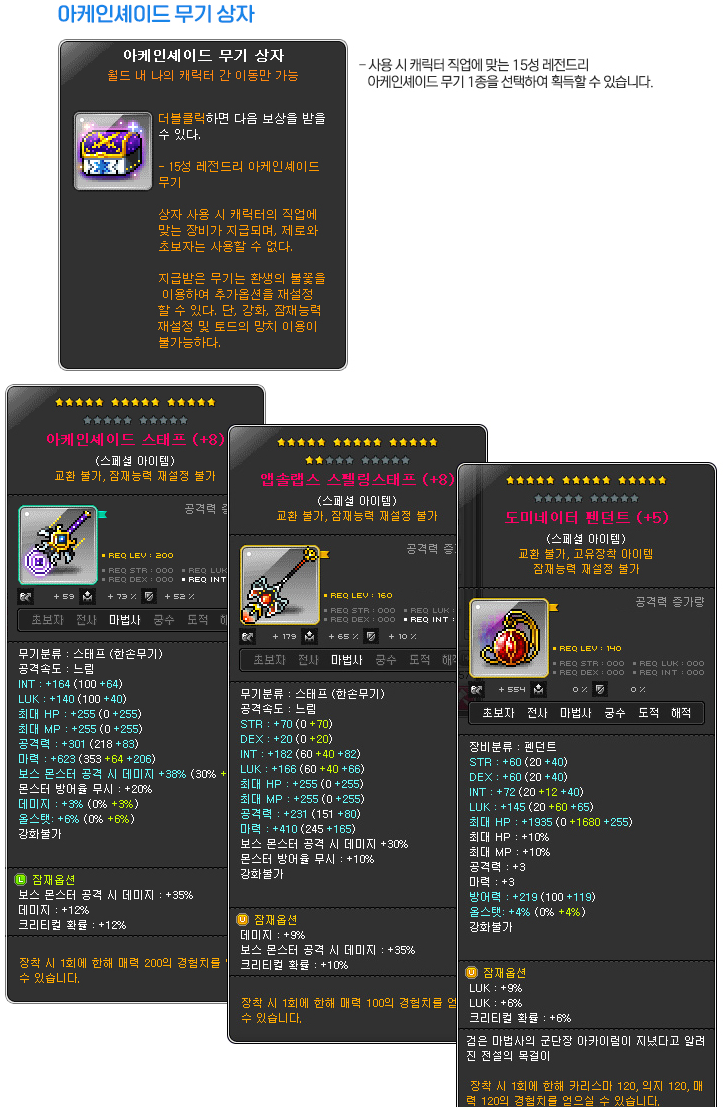 초보자/노블레스/시티즌/레전드의 경우 1차 전직 이후 아케인셰이드 무기 상자, 앱솔랩스 무기상자, 도미네이터 펜던트 상자를 사용할수 있습니다