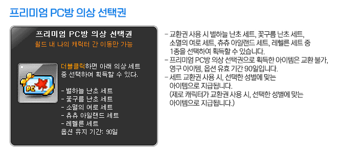 메이플 ID당 한번만, 프리미엄 PC방에서 접속한 101레벨 이상 캐릭터로 받을수 있습니다.