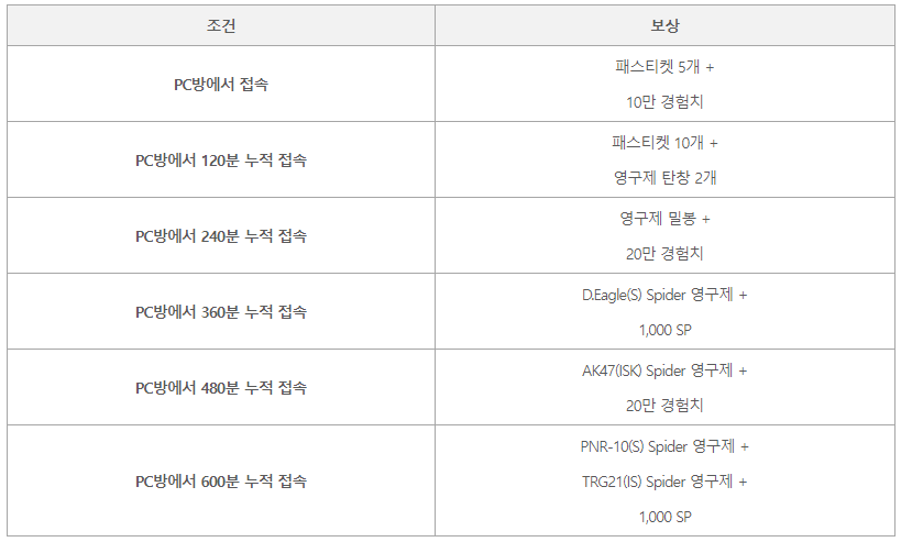 PC방 접속 시간 달성하고 2000sp와 영구제 밀봉 TRG210(S) spider 영구제 등 다양한 아이템의 획득 기회!
